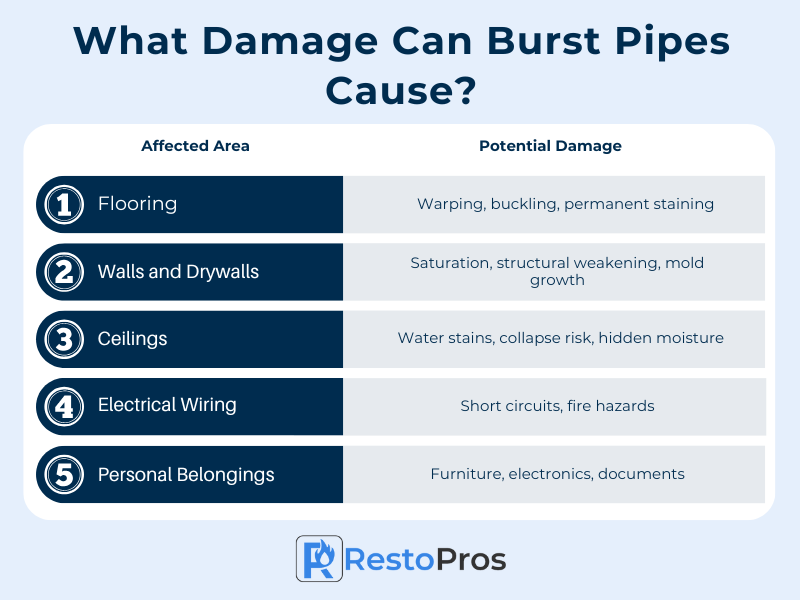 A burst pipe causes more than plumbing problems. The extensive damage often spreads to: